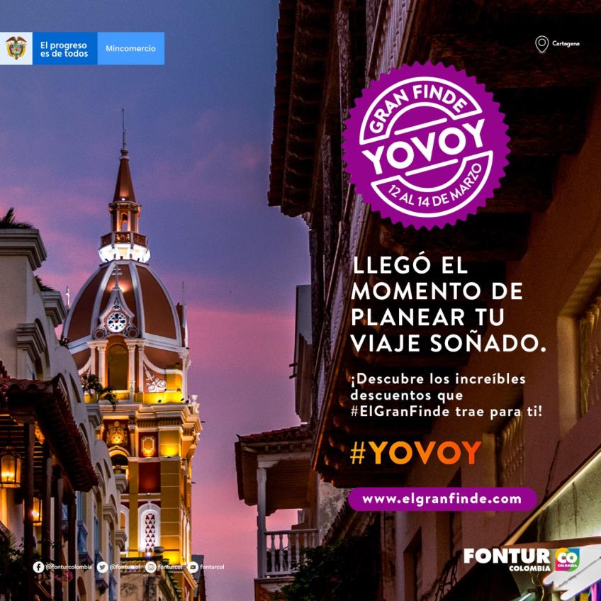 Bogotá D.C., 11 de marzo de 2021 (@fonturcol). Como parte de la estrategia de reactivación segura del turismo en Colombia durante 2021, el Ministerio de Comercio, Industria y Turismo a través de Fontur, anunció que desde las 00:00 horas de este viernes 12 de marzo, y hasta las 11:59 p.m. del domingo 14, se realizará tercera edición del ‘Gran Finde’, una dinámica comercial de 72 horas fundamental para impulsar la demanda de servicios turísticos.