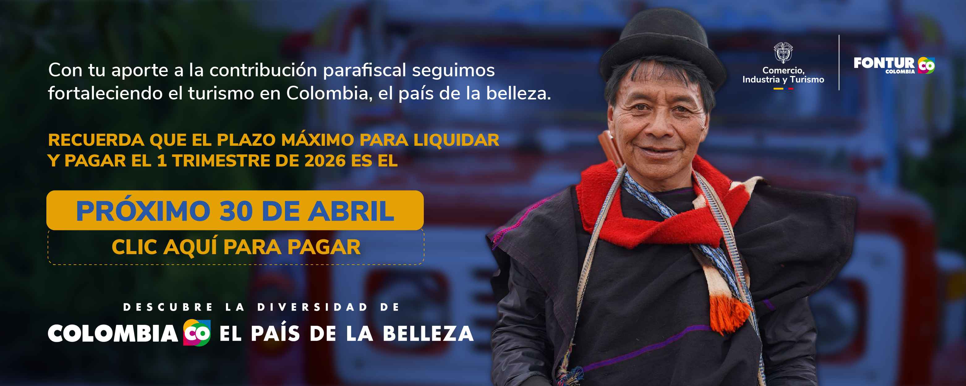 Título con línea decorativa Noticias Comunicados El ministerio de Comercio, Industria y Turismo celebra premio en los India Catalina con la campaña ‘Descubre la Diversidad de Colombia, El País de la Belleza Publicado Abr 18, 2026 Comunicados Gobierno de las Oportunidades lanza por primera vez convocatoria de turismo inclusivo para la población LGBTIQ+ de El País de la Belleza Publicado Abr 15, 2026 Comunicados Colombia implementa herramienta innovadora de la UNESCO para transformar la gestión turística en los Pueblos Patrimonio Publicado Abr 8, 2026 Paginación Siguiente página Ver todos los comunicados Video Full Width Autoplay Título con línea decorativa Galería el país de la belleza Ver galería completa Título con línea decorativa Galería de videos Síguenos Síguenos Título con línea decorativa Aliados de nuestra gestión
